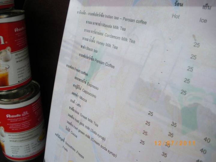 เมนูของร้าน มีครบทั้ง ชาอินเดีย กาแฟเปอร์เซีย รวมทั้งกาแฟสด