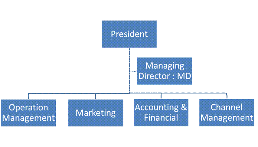 ประธาน President ดูแล โครงการลงทุนต่างๆ พิจารณาและอนุมัติ กำหนดแผนการดำเนินงานต่างๆ ประกาศใช้แผนการดำเนินงาน กำหนดกรอบ วิสัยทัศน์ เป้าหมาย พันธกิจ