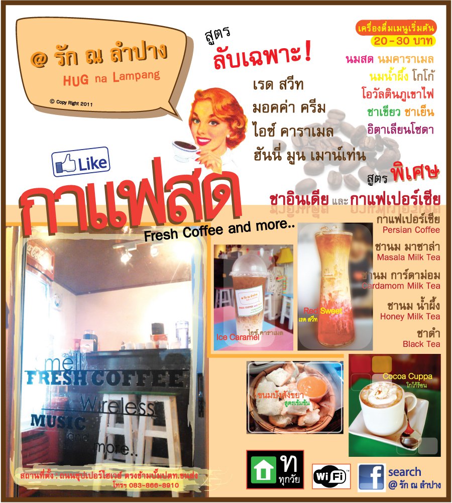 ร้านกาแฟสด รัก ณ ลำปาง เปิดร้านวันแรก.. วันศุกร์ ที่ 10 ขึ้น 9 ค่ำ เดือนมิถุนายน พุทธศักราช 2554 ร้านมีเมนูกาแฟสดหลากหลาย และมี ชาอินเดีย กาแฟเปอร์เซีย ซึ่งเป็นที่รู้จักและมีชื่อเสียงเพิ่มขึ้นทุกวันในวงการชา กาแฟ ในประเทศไทย แต่เดิมนั้น ชาอินเดีย หากจะได้ทาน ต้องบินไปถึง ประเทศอินเดียถึงจะได้ลิ้มรสกัน ที่อินเดียนั้นดื่มชา มากกว่ากาแฟ ทว่าในวันนี้ ชาวลำปางสามารถหาทานชาอินเดียได้แล้ว โดย ร้านกาแฟสด รัก ณ ลำปาง ได้นำมาให้ท่านได้ลิ้มลองแล้ว นอกจากกาแฟเมนูต่างๆแล้วร้านยังมีองค์ประกอบที่ครบถ้วนที่ร้านกาแฟควรมีคือ เพลงเพราะๆ ให้ลูกค้าฟังอินเตอร์เน็ต WiFi ให้ลูกค้าเล่น และสวนดอกไม้ขนาดย่อมเป็นสวนพิทูเนีย ให้ลูกค้าชมอีกด้วย ทางร้านทันสมัยอย่างมากมี face book fan page กับเขาด้วย ชาวจังหวัดลำปางหรือผู้ท่องเที่ยวไปในจังหวัดลำปาง อย่าลืมกด like กันนะครับ https://www.facebook.com/Hug.na.Lampang
