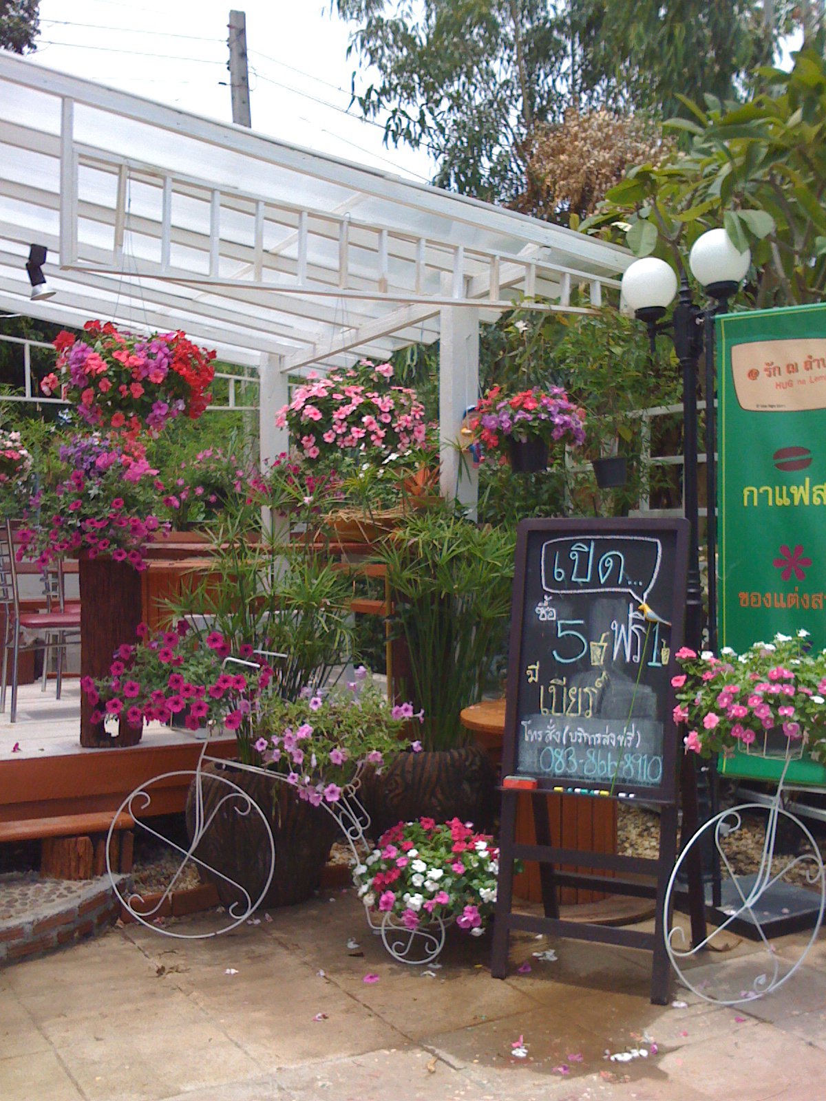 ภายในร้าน รัก ณ ลำปาง กาแฟสด ประดับด้วย สวนพิทูเนีย หลากสี ทั้งสีขาว สีชมพู สีม่วง โทนสีก็มีทั้งเข้มและอ่อน เราสามารถเห็นผึ้งตัวน้อยๆและผีเสื้อ บินมาลิ้มรสน้ำหวานจากดอกไม้ในช่วงเช้าและช่วงบ่าย มองสวนดอกไม้แล้วทำให้รู้สึกอารมณ์เย็น เนื่องด้วยเมืองเหนือ ขึ้นชื่อว่าเป็นเมืองดอกไม้อยู่แล้ว การที่ร้าน รัก ณ ลำปาง ปลูกดอกไม้ ถือเป็นการอนุรักษ์ วัฒนธรรมของชาวเหนือ ที่รักในธรรมชาติและความสวยงามของไม้ดอก ไม้ประดับ หน้าป้ายกระดานดำ มีเขียนโปรโมชั่นของกาแฟสด ซื้อ 5 แก้ว ฟรี 1 แก้ว เขียนอยู่ ว่าแต่ เอ… ตอนนี้โปรโมชั่นนี้ยังมีอยู่มั๊ยน๊า ลองติดต่อ ร้าน รัก ณ ลำปาง หรือ แวะเข้าเยี่ยมดื่ม กาแฟสด และ ชา กัน ครับ